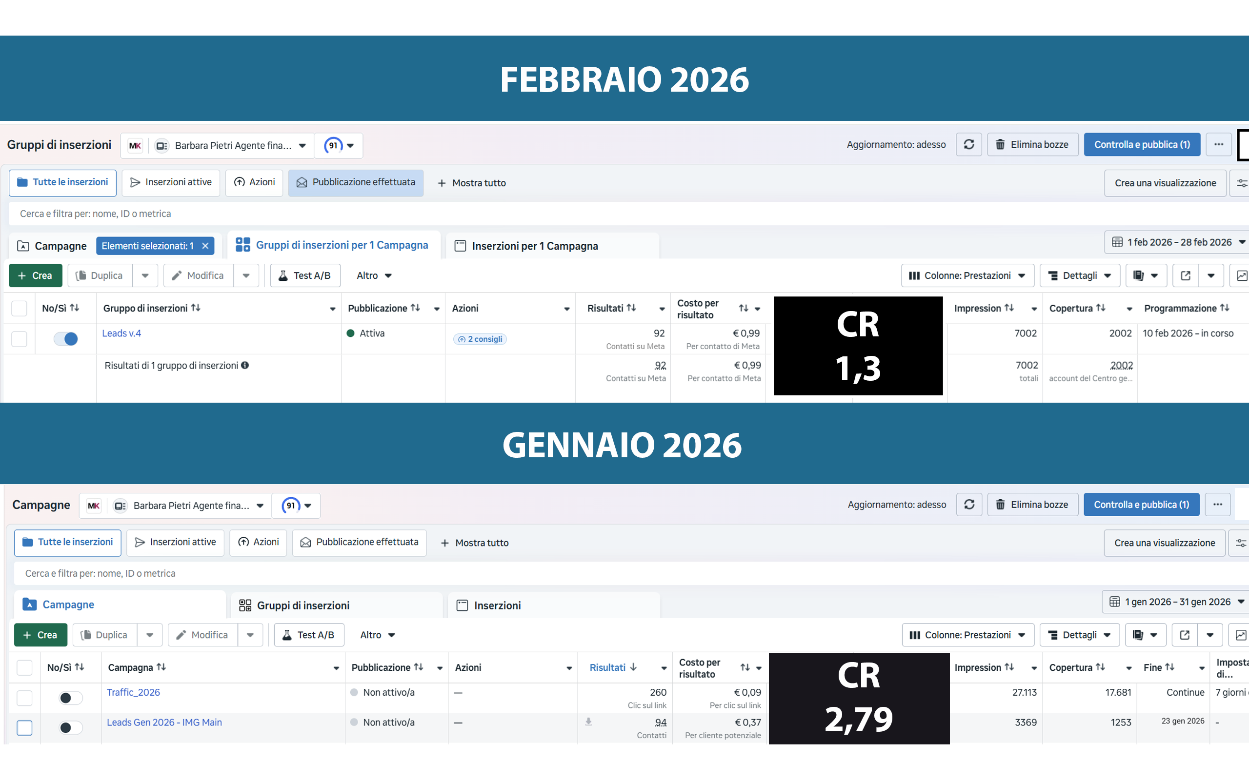 – 1° Mese: 94 Contatti – Costo per lead: €0,37 – Lead Conversion Rate (Impression → Lead): 2,79%